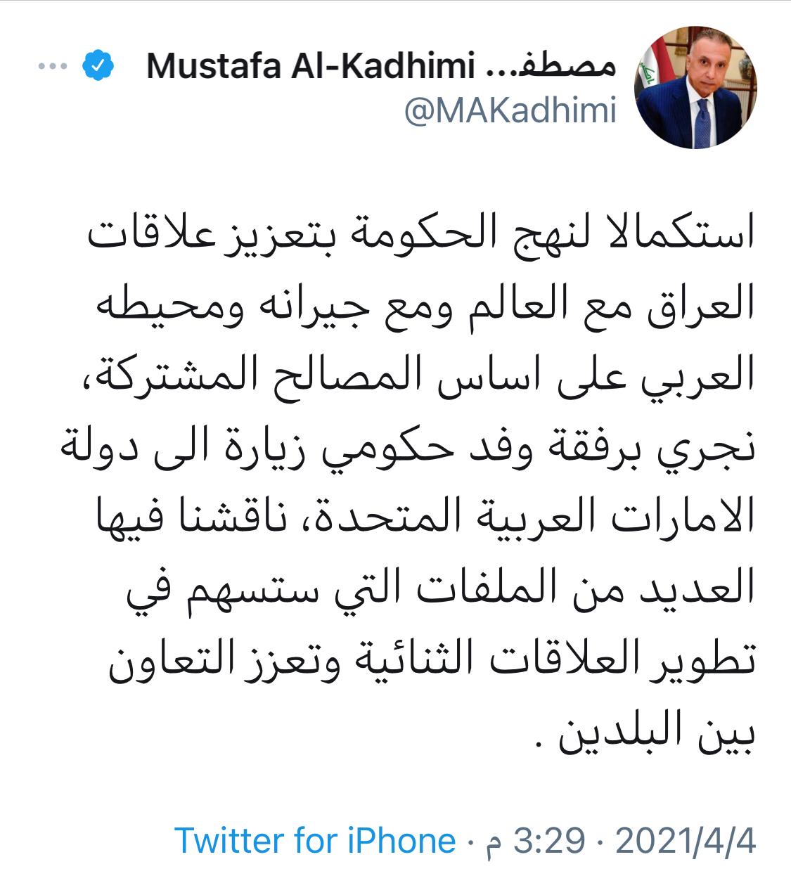 الكاظمي: ناقشنا خلال زيارتنا للامارات العديد من الملفات التي ستسهم في تطوير العلاقات الثنائية