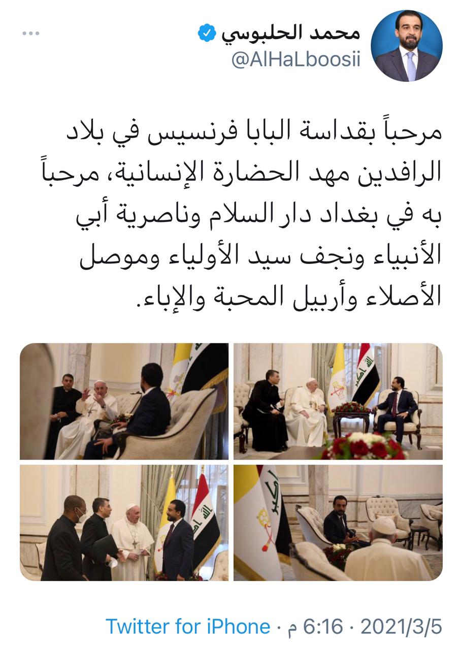 الحلبوسي مغرداً: مرحباً بقداسة البابا فرنسيس في بلاد الرافدين مهد الحضارة الإنسانية