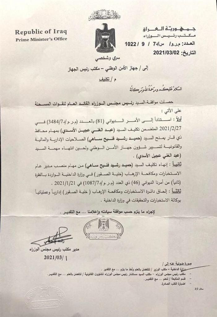 بالوثيقة .. الكاظمي يكلف حميد رشيد فليح بتسيير شؤون جهاز الامن الوطني