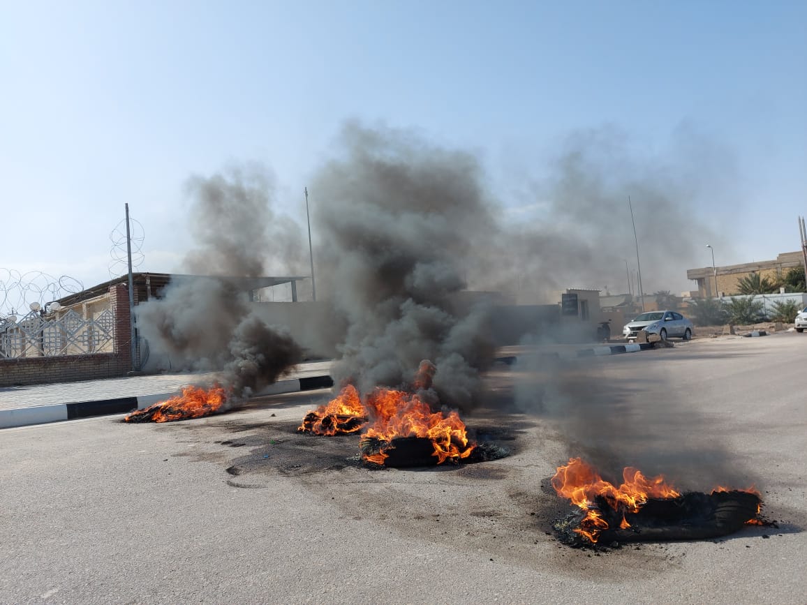 قطع جسر النصر وسط الناصرية بالاطارات المحترقة من قبل المتظاهرين