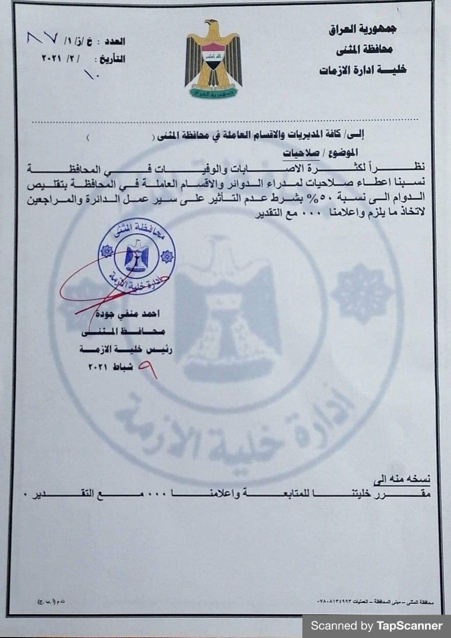 بالوثيقة .. المثنى تمنح مدراء الدوائر صلاحية تقليص الدوام بسبب ارتفاع الاصابات بكورونا