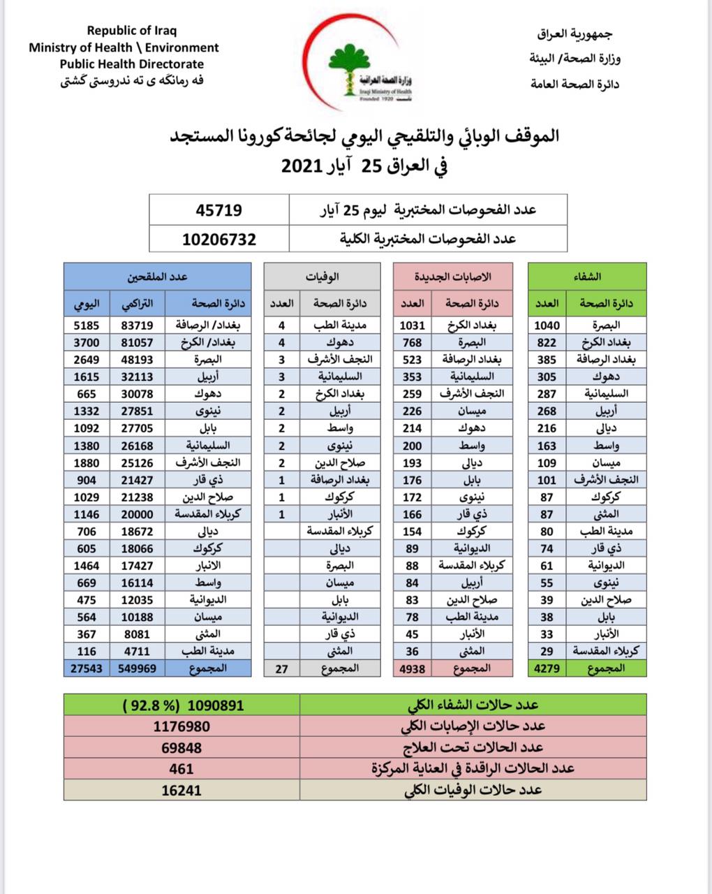 الصحة تعلن تسجيل 4938 اصابة جديدة بكورونا في عموم العراق
