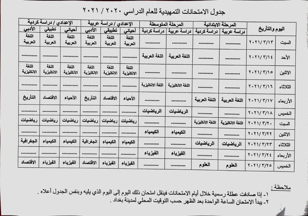 الجدول الخاص بالامتحانات التمهيدية للمراحل المنتهية للعام الدراسي 2020 – 2021