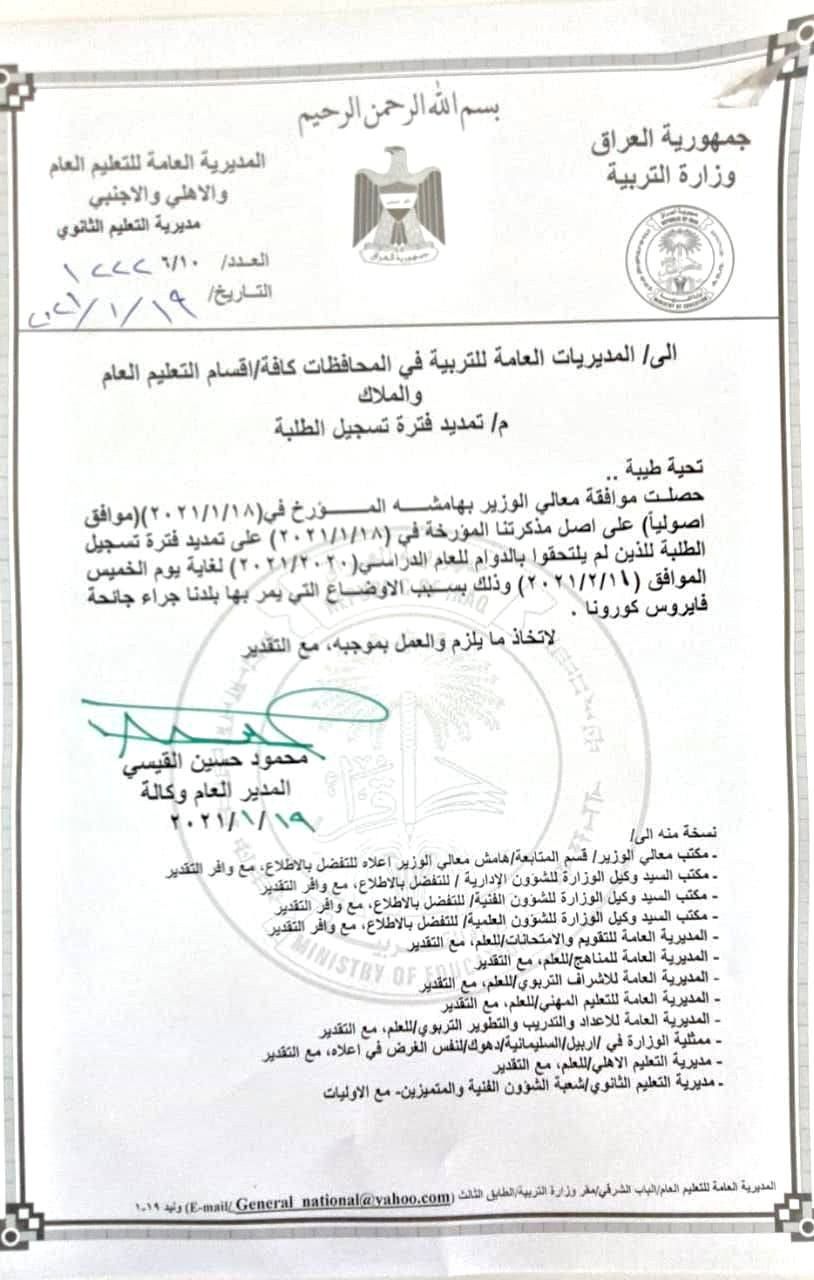 بالوثيقة .. التربية تقرر تمديد فترة تسجيل الطلبة الذين لم يلتحقوا بالدوام للعام الدراسي الحالي