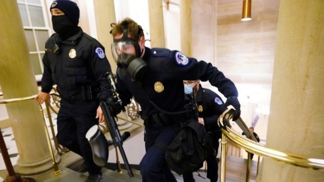 قوات الشرطة والحرس الوطني الاميركي يخرجون انصار ترامب من مبنى الكونغرس