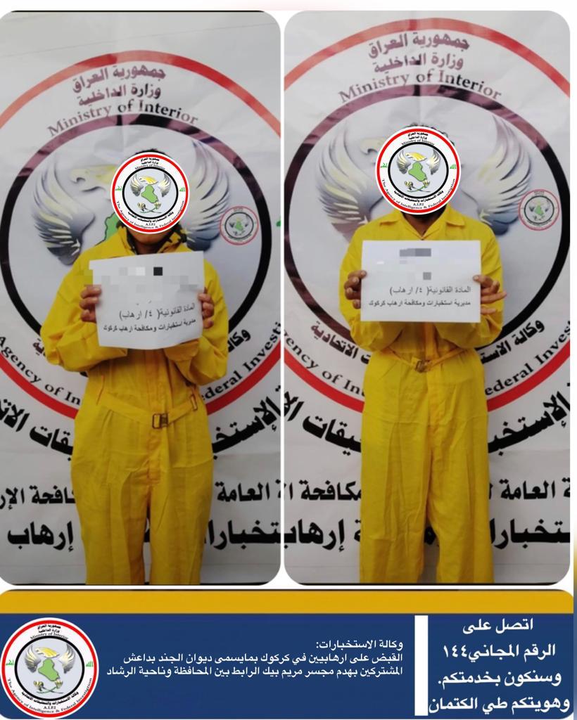 وكالة الاستخبارات تعلن القبض على ارهابيين اثنين بمايسمى ديوان الجند في كركوك