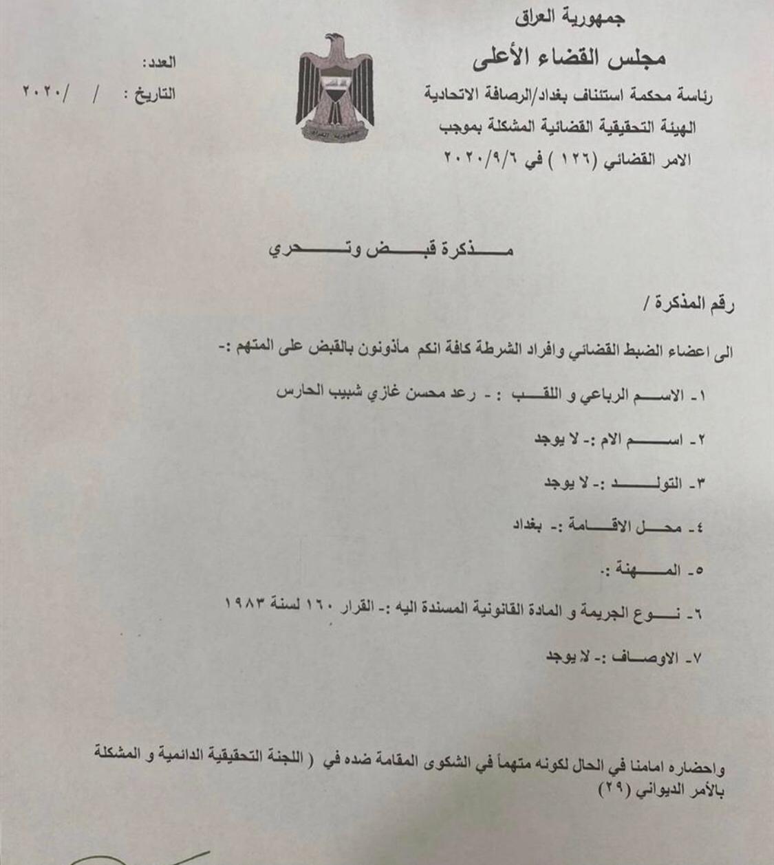 بالوثيقة .. صدور مذكرة قبض بحق مستشار رئيس الوزراء رعد الحارس