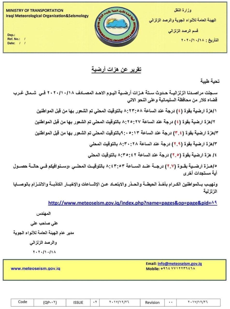 النقل تسجل حدوث 6 هزات أرضية في قضاء كلار بمحافظة السليمانية