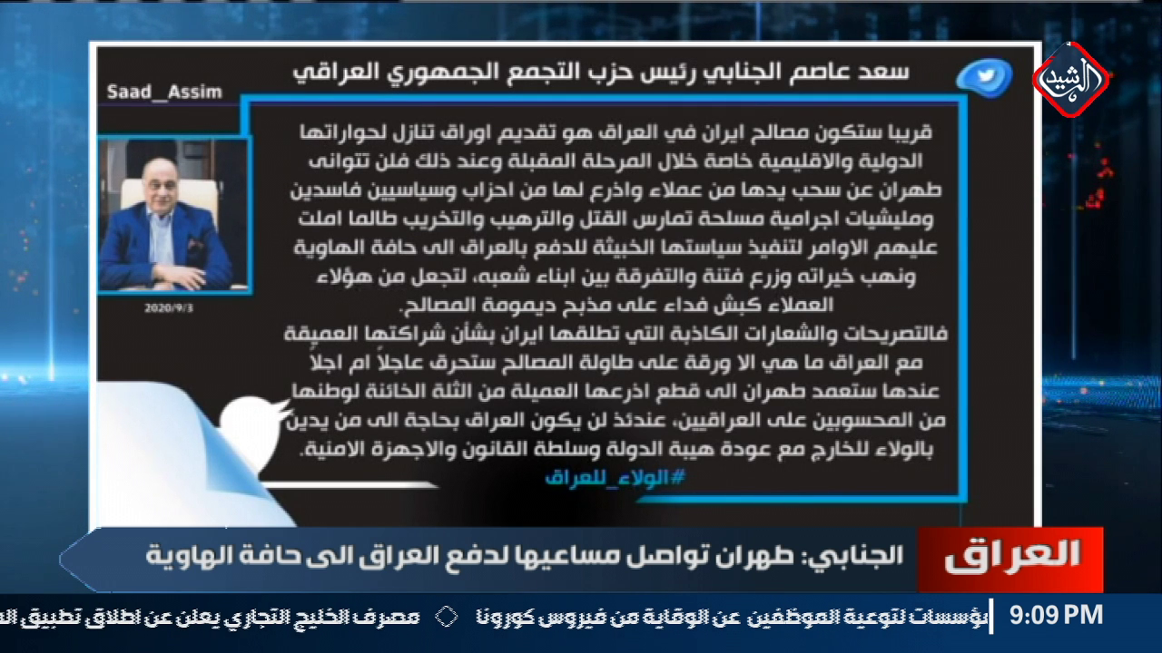 الجنابي: طهران تواصل مساعيها لدفع العراق الى حافة الهاوية
