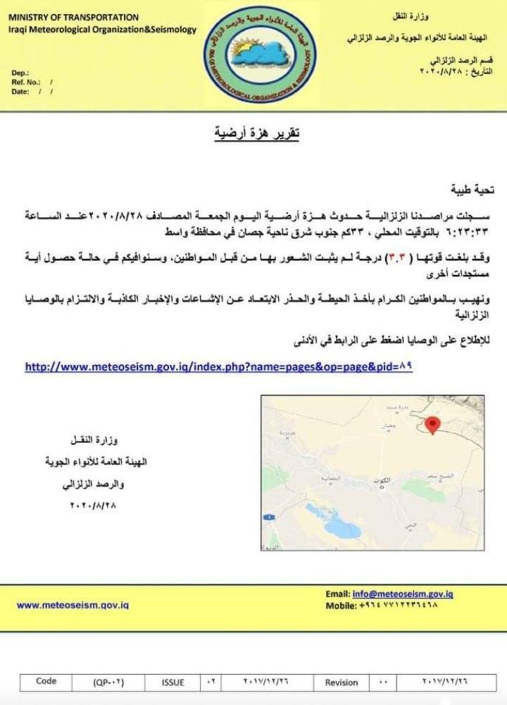 النقل تعلن تسجيل هزة أرضية بقوة (3،3) درجة في محافظة واسط