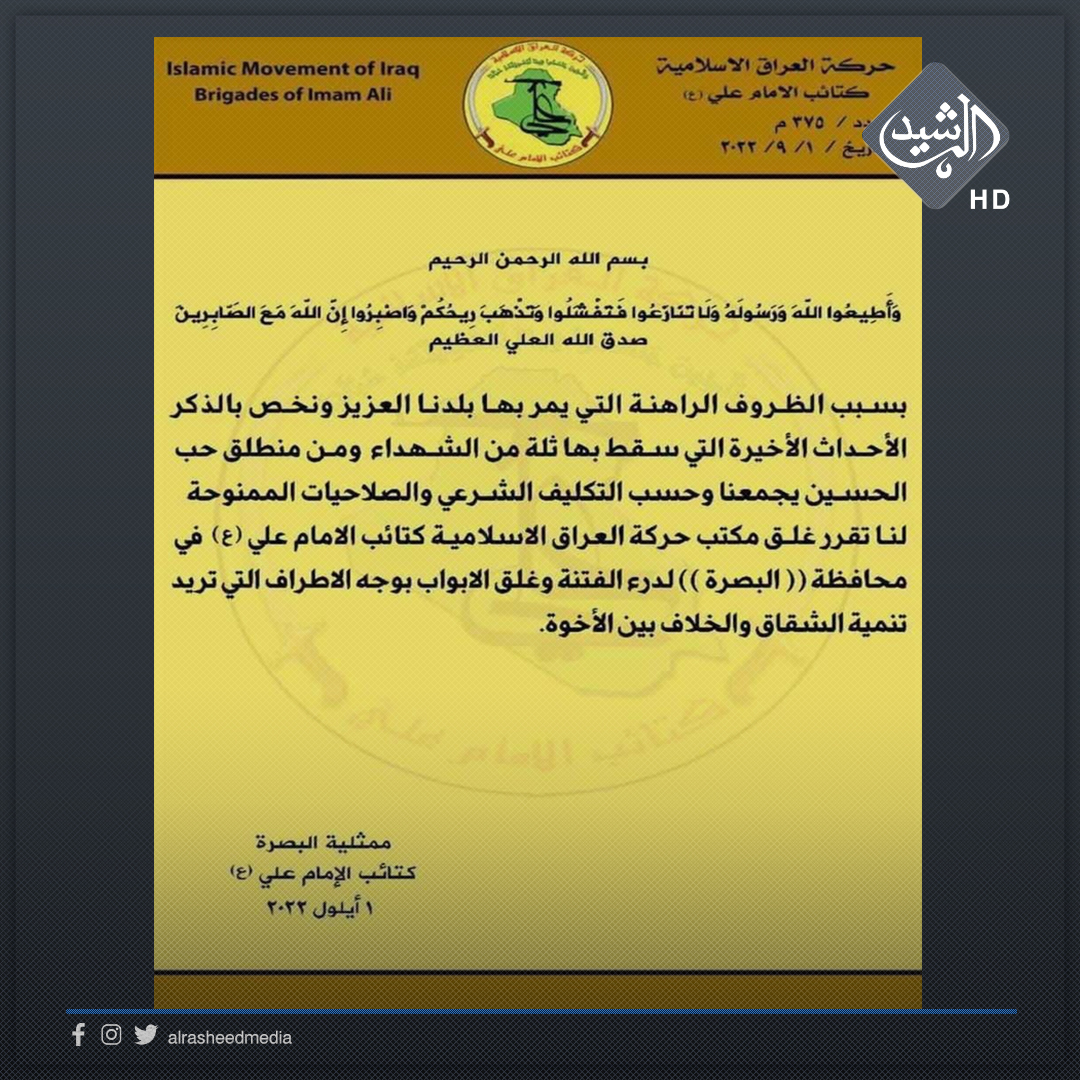 كتائب الامام علي تعلن اغلاق مكتبها في محافظة البصرة (وثيقة)