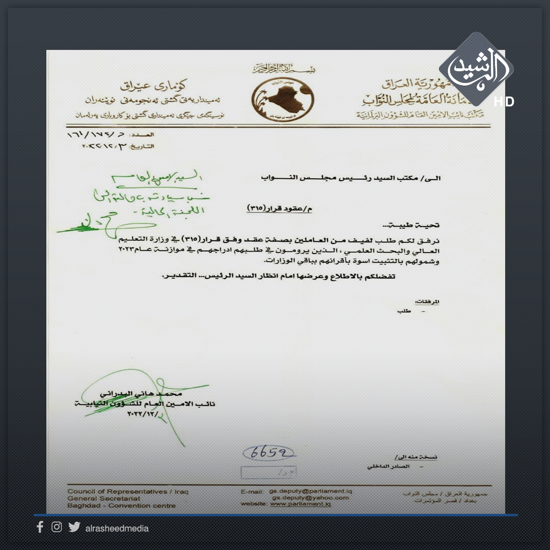 بالوثيقة.. الحلبوسي يحيل طلب إدراج عقود (315) الى اللجنة المالية وتضمينهم في الموازنة