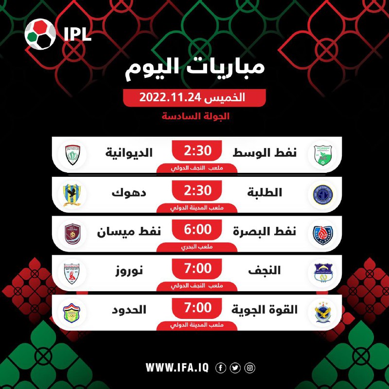 جدول مباريات اليوم الجمعة من منافسات الدوري العراقي الممتاز