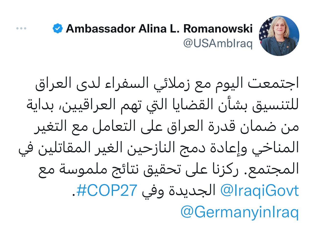 السفيرة الأمريكية للرشيد: لدينا خبرة بالتعامل مع ملف التغير المناخي ومن الممكن ان نتعاون سوية مع العراق