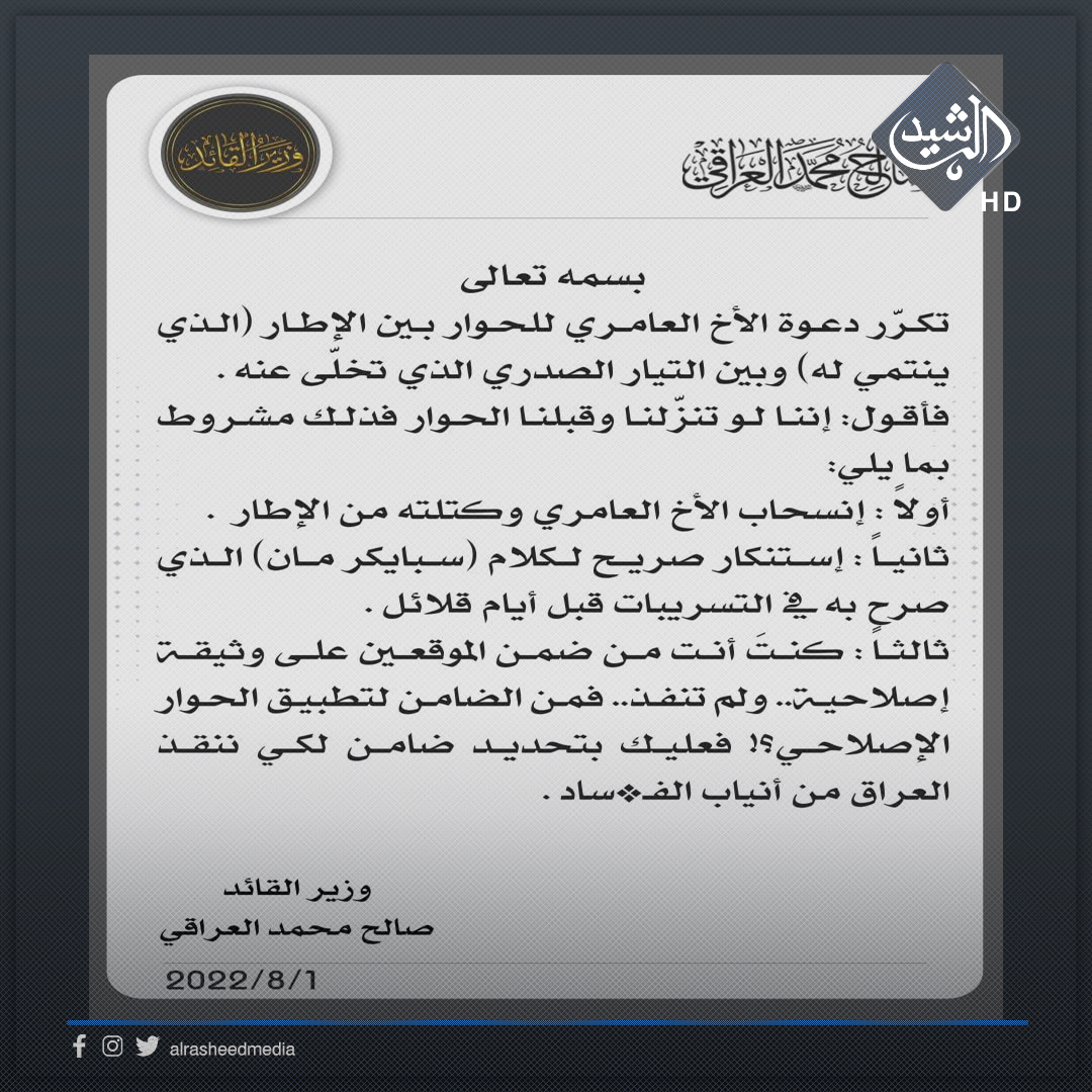 العامري يناشد السيد الصدر: ادعوك مخلصا للحوار الجاد مع الاطار