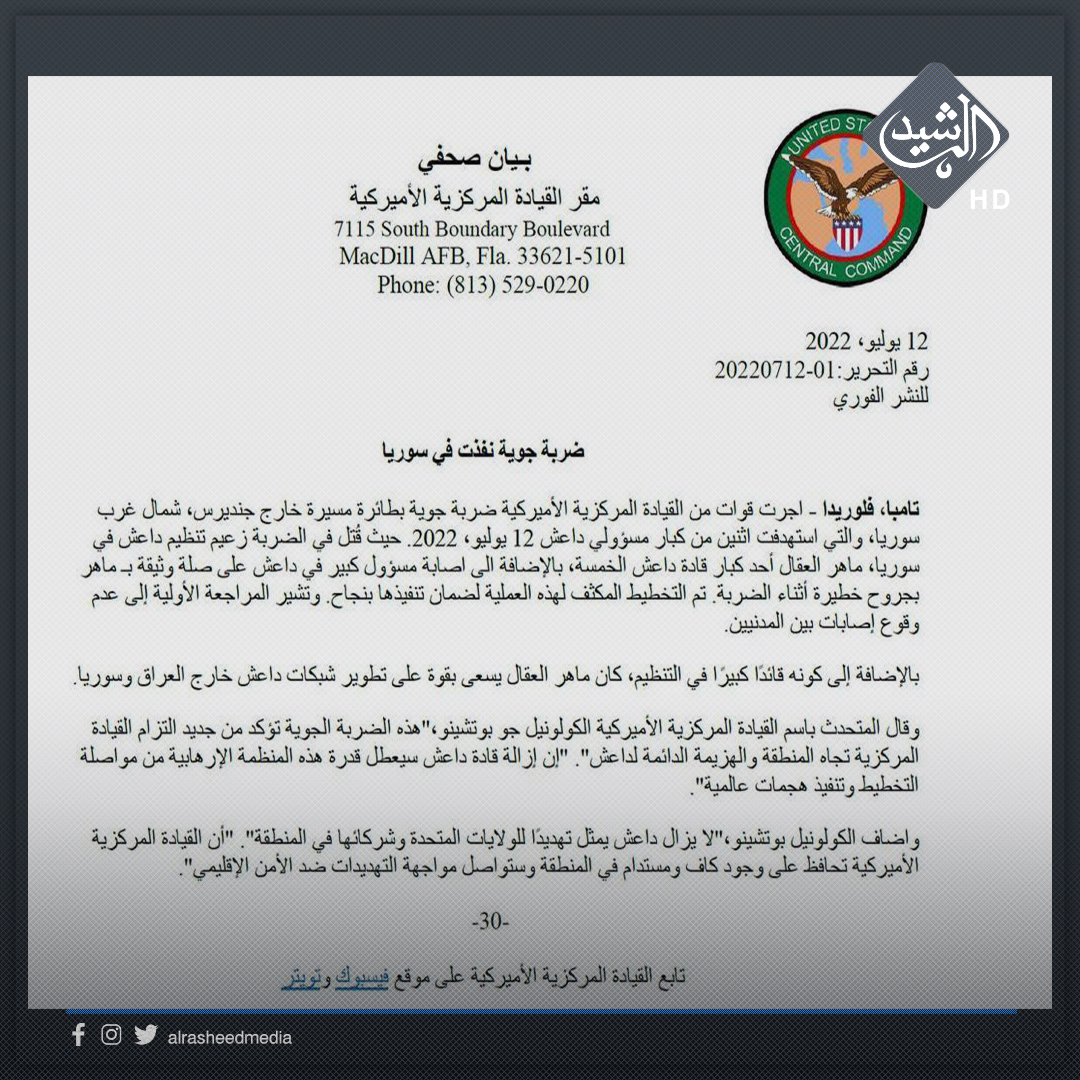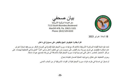 القيادة المركزية الامريكية تعلن اعتقال مسؤول بارز بداعش في سوريا
