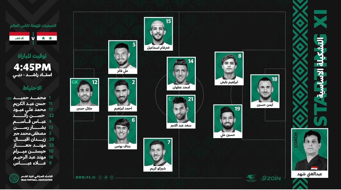 التشكيلة الرسمية لمنتخب العراق لمواجهة نظيره السوري في بطولة الاردن الدولية