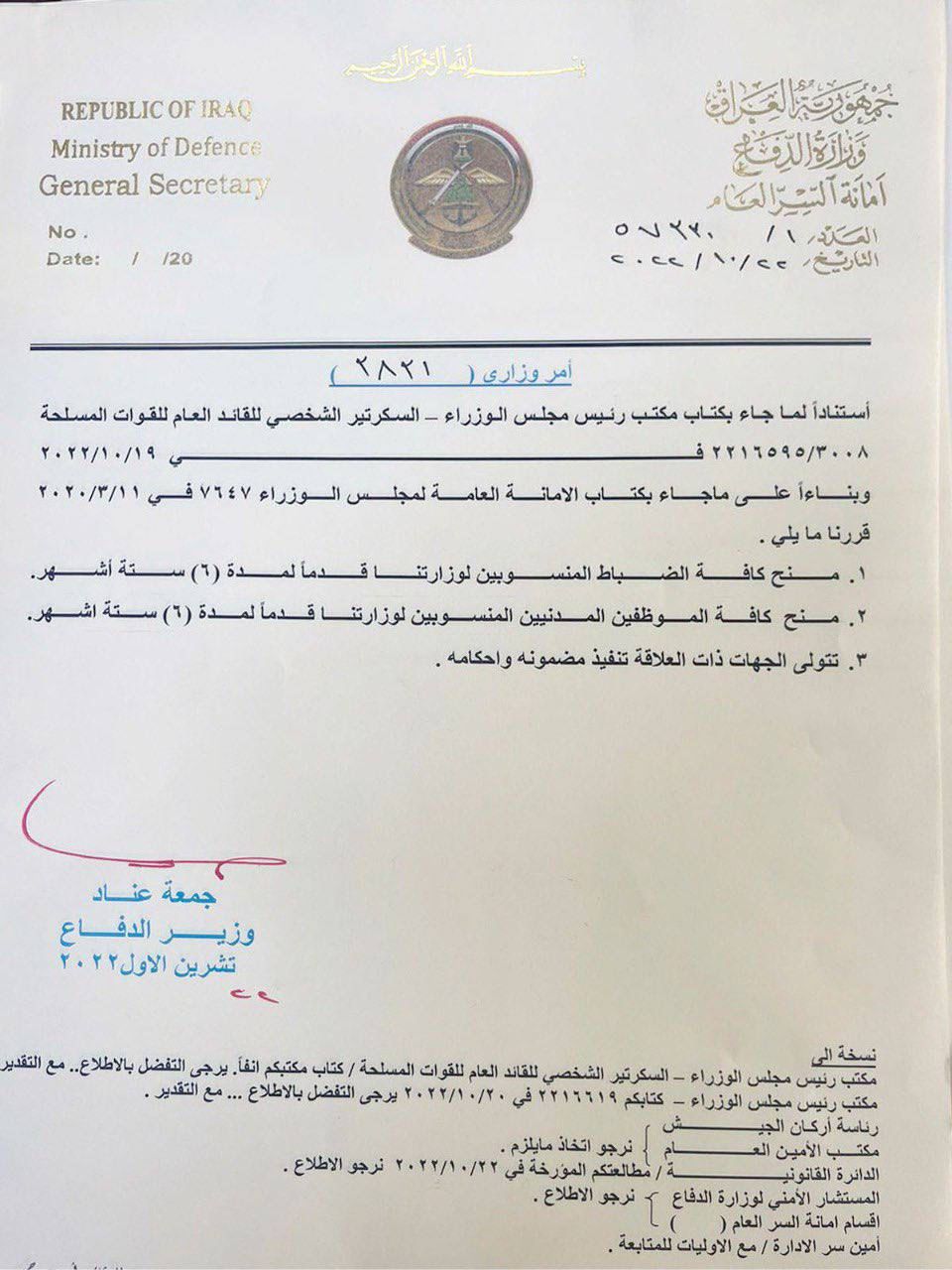 بالوثيقة.. منح جميع الضباط والموظفين من منتسبي وزارة الدفاع قدماً لمدة (6) أشهر