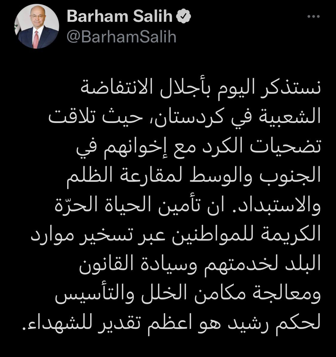 رئيس الجمهورية: حلبجة الجرح الغائر في وجداننا مُجسِدة معاناة الشعب الكردي وكل العراقيين