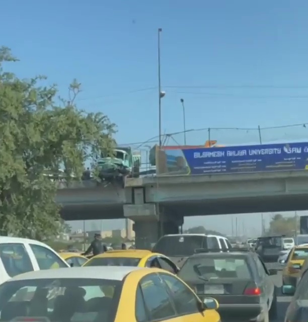 حادث مروع أعلى سريع محمد القاسم.. شاحنة كادت ان تسقط وتتسبب بكارثة(فيديو)