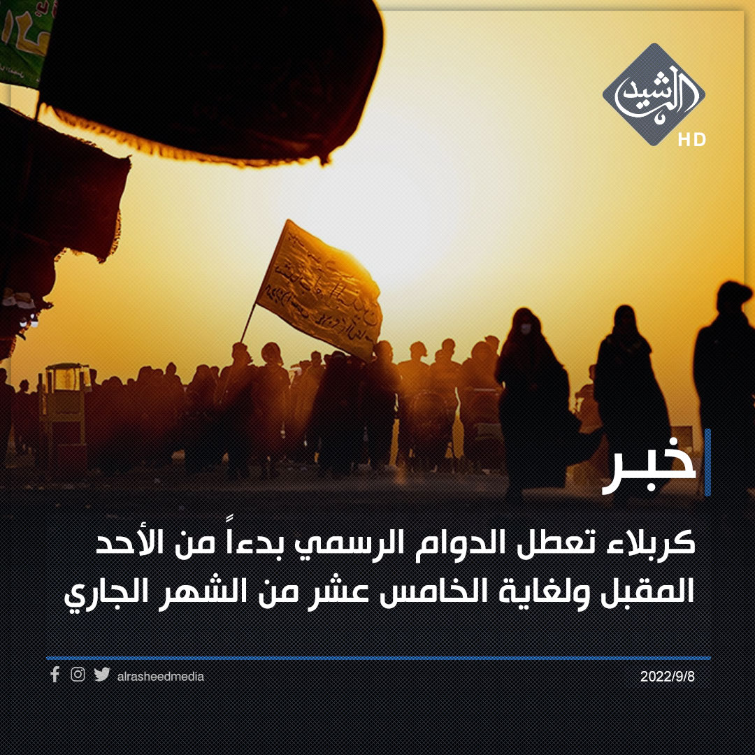 كربلاء تعطل الدوام الرسمي بدءاً من الأحد المقبل ولغاية الخامس عشر من الشهر الجاري