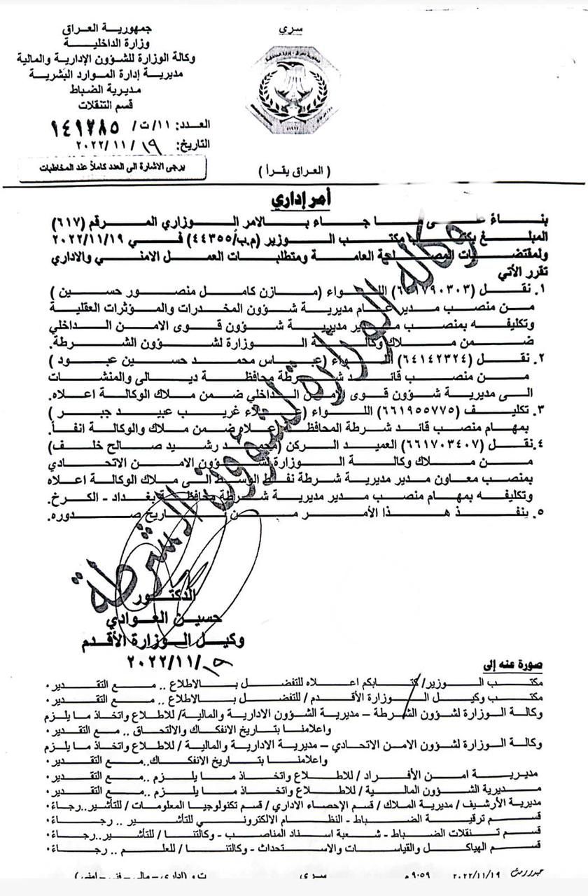 بالوثائق.. صدور الامر الاداري بنقل الضباط من وزارة الداخلية الى مراكز الشرطة لسد النقص