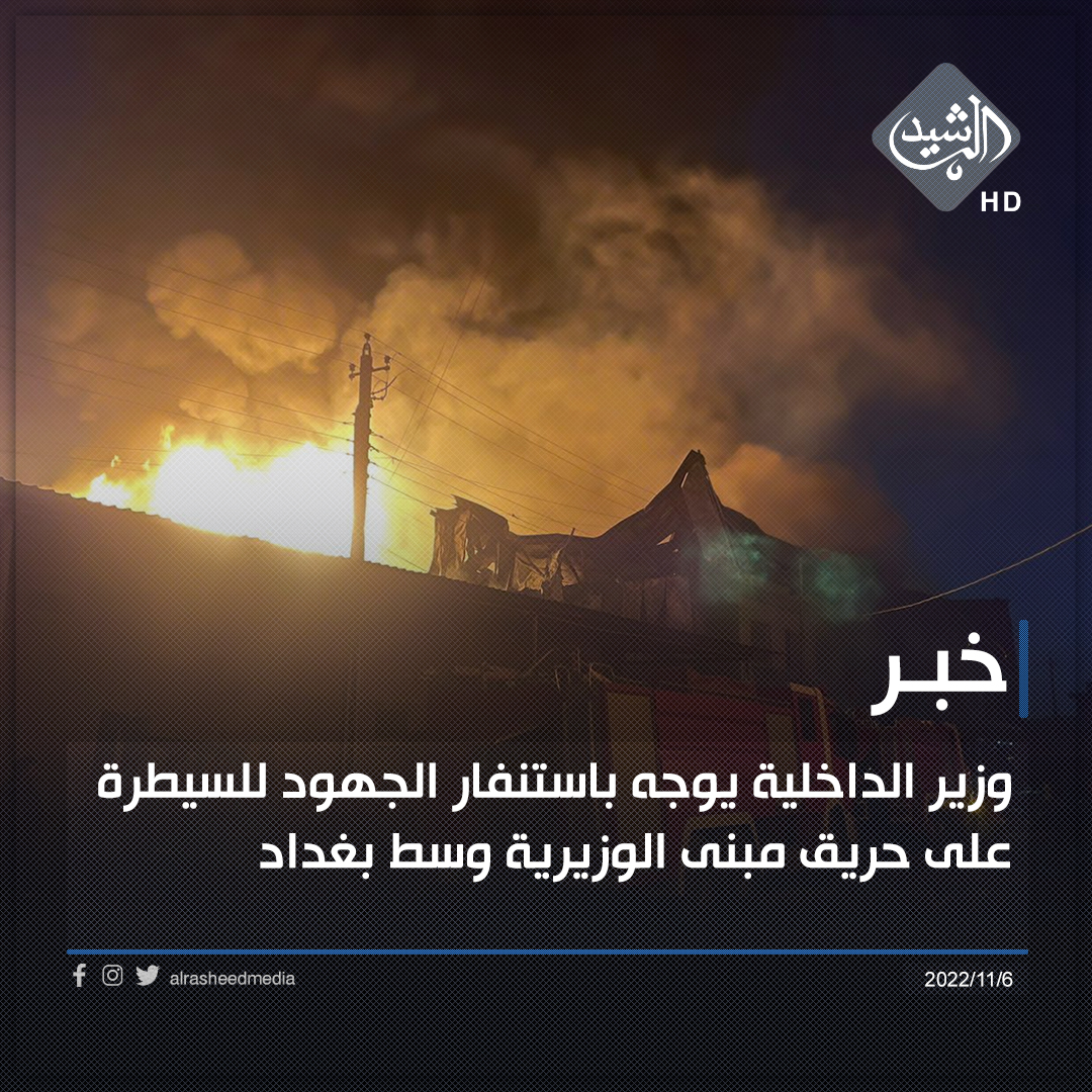 وزير الداخلية يوجه باستنفار الجهود للسيطرة على حريق مبنى الوزيرية وسط بغداد