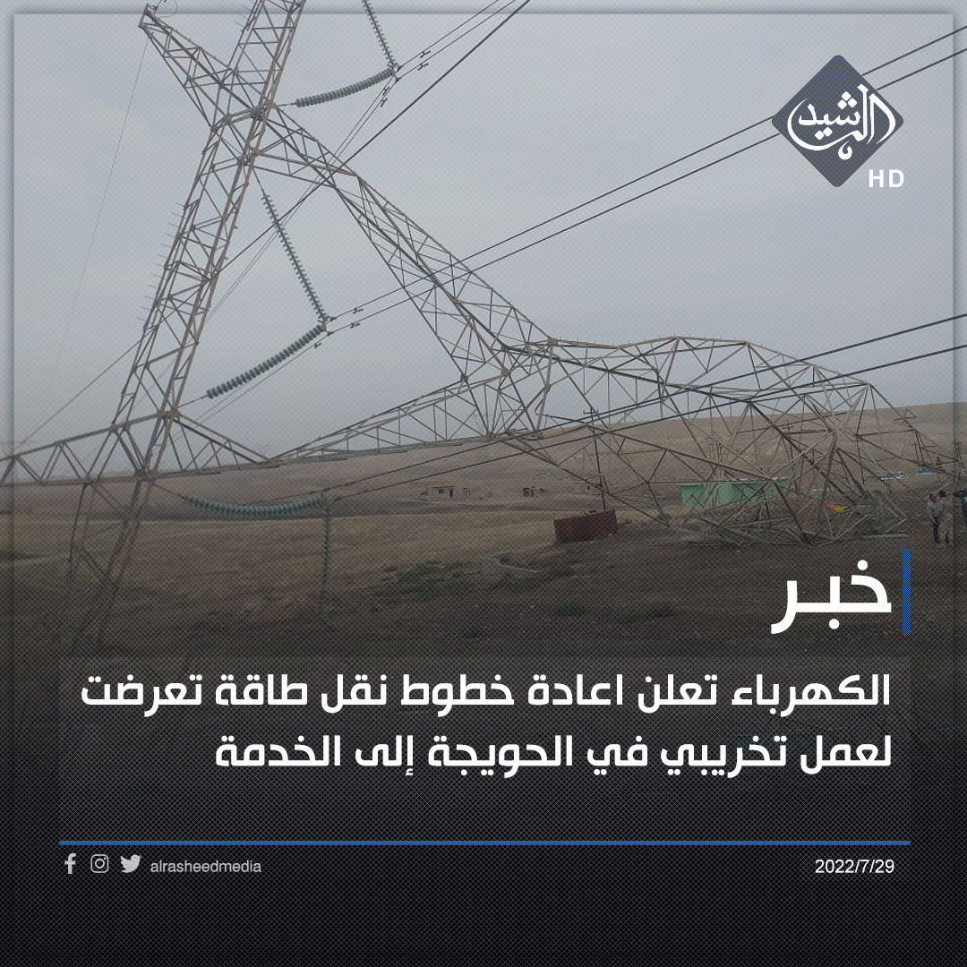 الكهرباء تعلن اعادة خطوط نقل طاقة تعرضت لعمل تخريبي في الحويجة إلى الخدمة