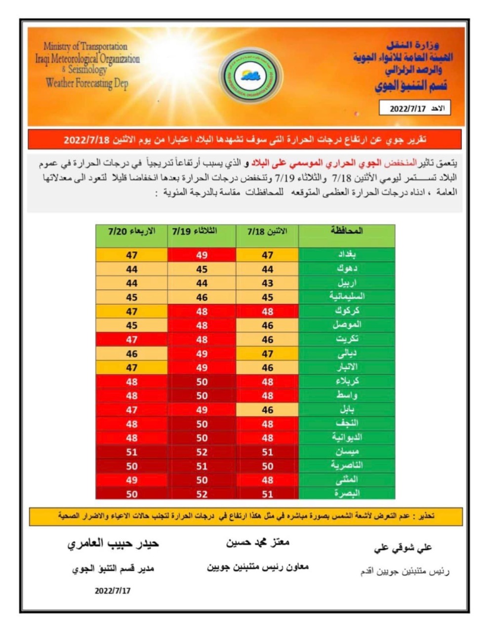 الانواء الجوية تصدر تقريرا خاصا بأرتفاع درجات الحرارة ليوم غد