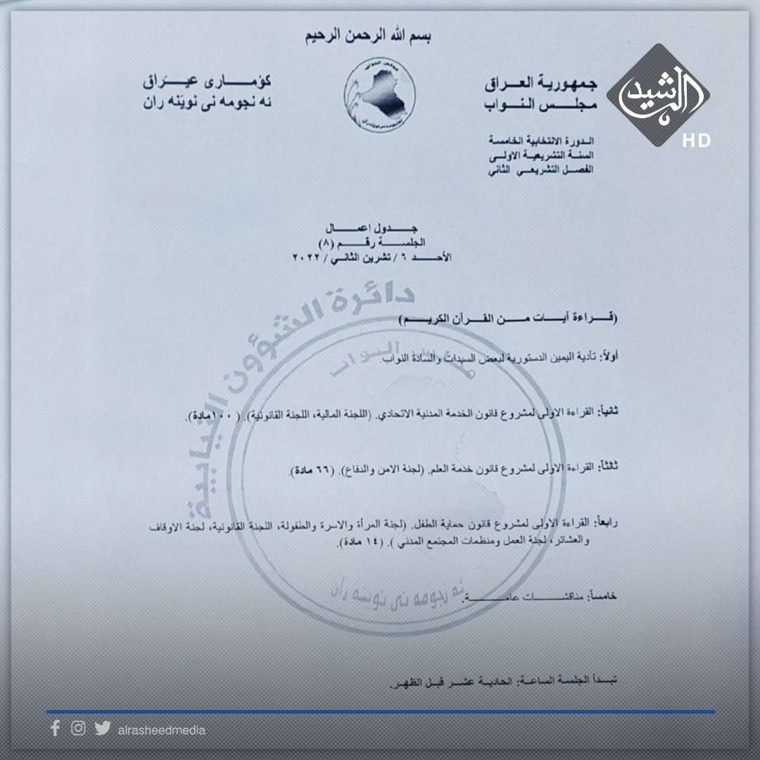 يتضمن خمس فقرات.. الرشيد تنشر جدول أعمال جلسة البرلمان ليوم غد