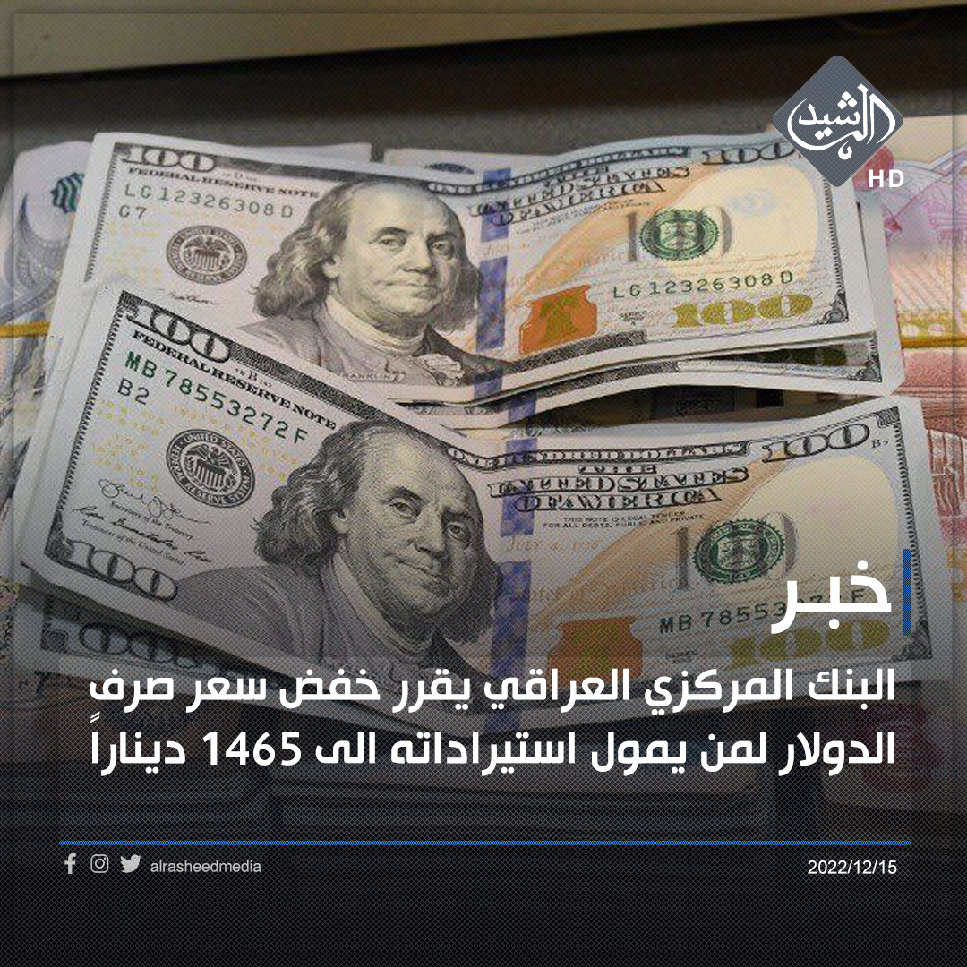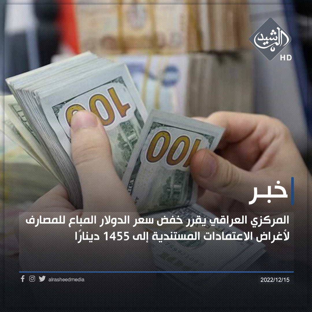 المركزي العراقي يقرر خفض سعر الدولار المباع للمصارف لأغراض الاعتمادات المستندية إلى ١٤٥٥ دينارًا