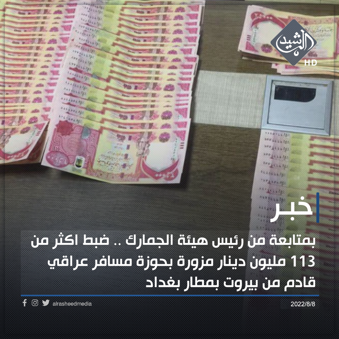 الجمارك: ضبط اكثر من 113 مليون دينار مزورة بحوزة مسافر عراقي قادم من بيروت بمطار بغداد