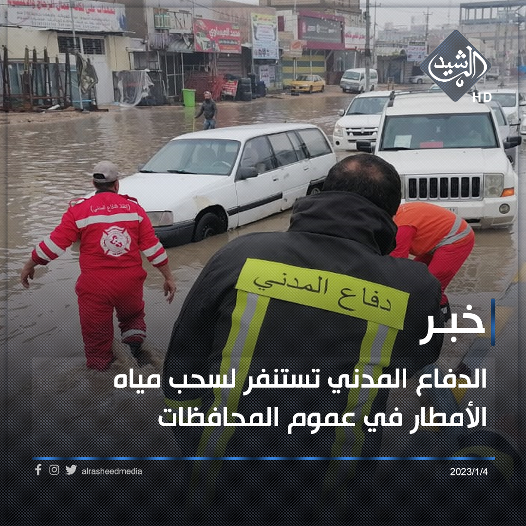 الدفاع المدني تستنفر جهدها وتسخر آلياتها لسحب مياه الأمطار في بغداد والمحافظات
