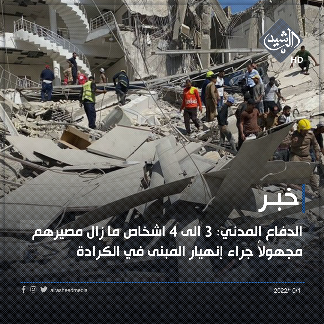 الدفاع المدني: 3 الى 4 اشخاص ما زال مصيرهم مجهولاً جراء إنهيار المبنى في الكرادة