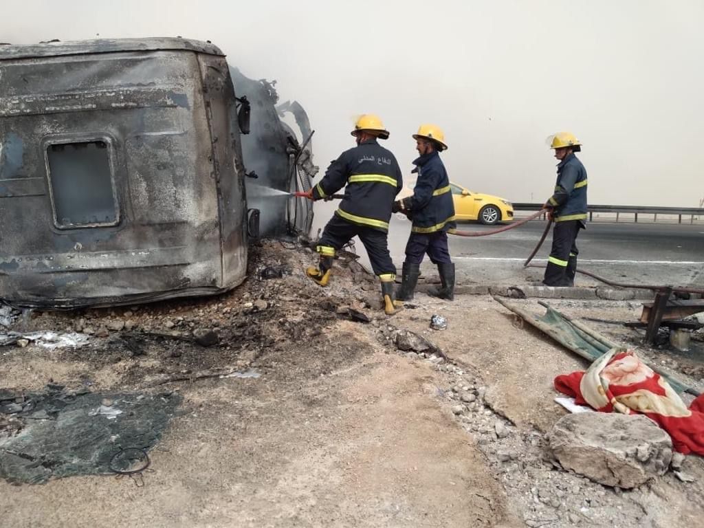 بالصور .. انتشال جثة سائق شاحنة بعد انقلابها واحتراقها على طريق ناصرية – بصرة