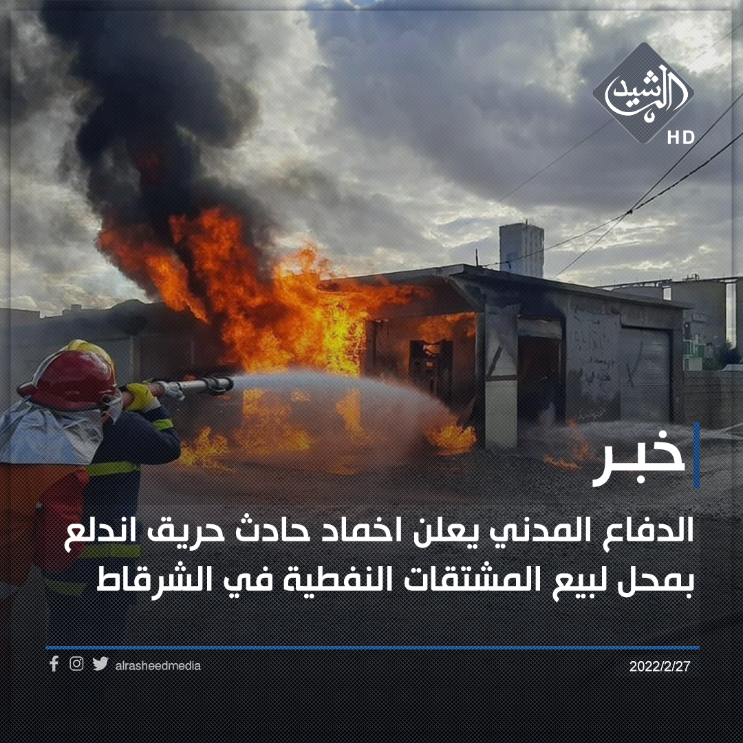 الدفاع المدني يعلن اخماد حادث حريق اندلع بمحل لبيع المشتقات النفطية في الشرقاط