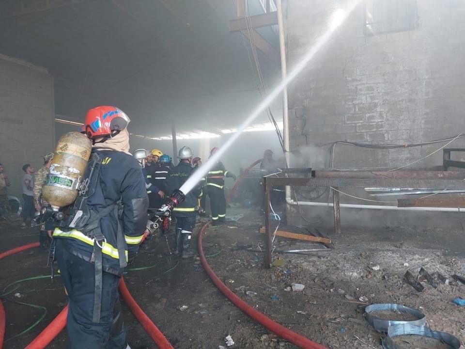 الدفاع المدني يكافح حريقا اندلع بمخازن للمواد الاحتياطية في شارع الظلال وسط بغداد
