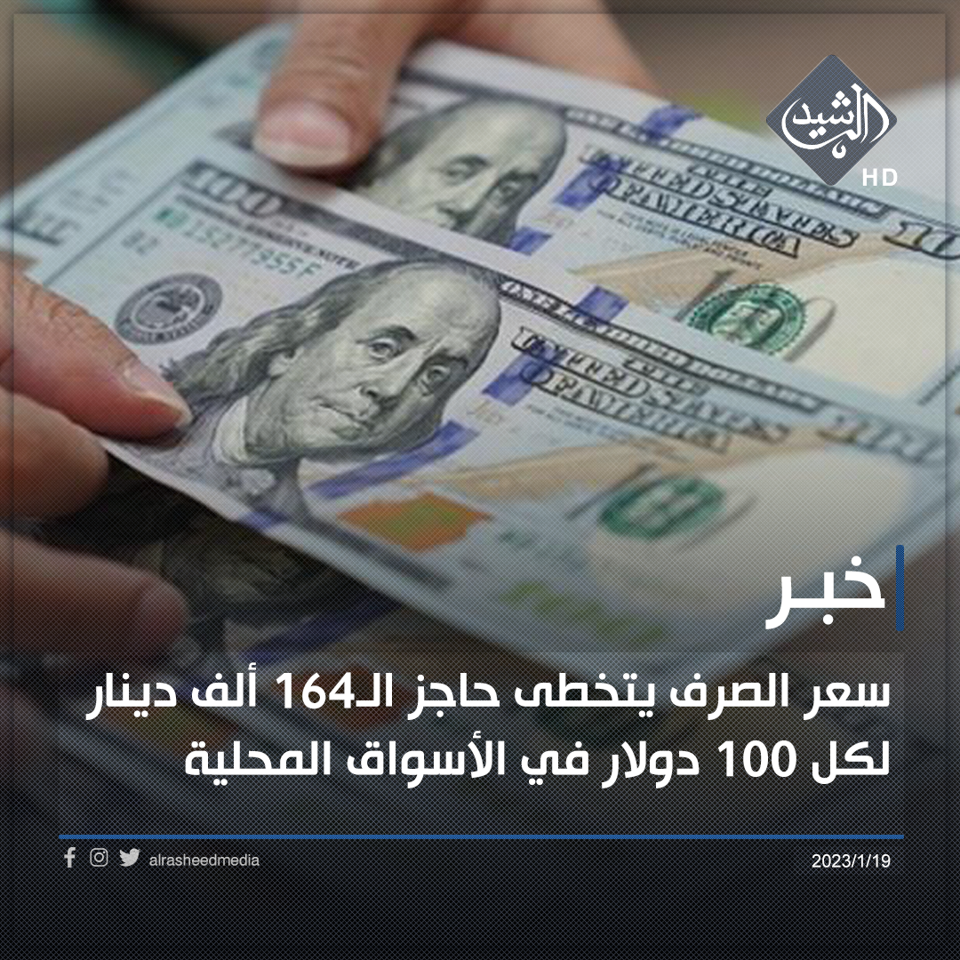 سعر الصرف يتخطى حاجز الـ١٦٤ ألف دينار لكل ١٠٠ دولار في الأسواق المحلية