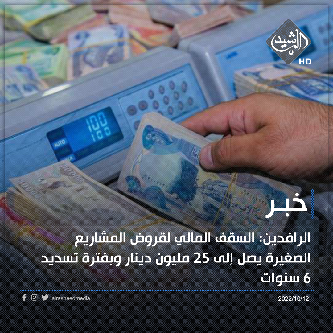الرافدين: السقف المالي لقروض المشاريع الصغيرة يصل إلى 25 مليون دينار وبفترة تسديد 6 سنوات