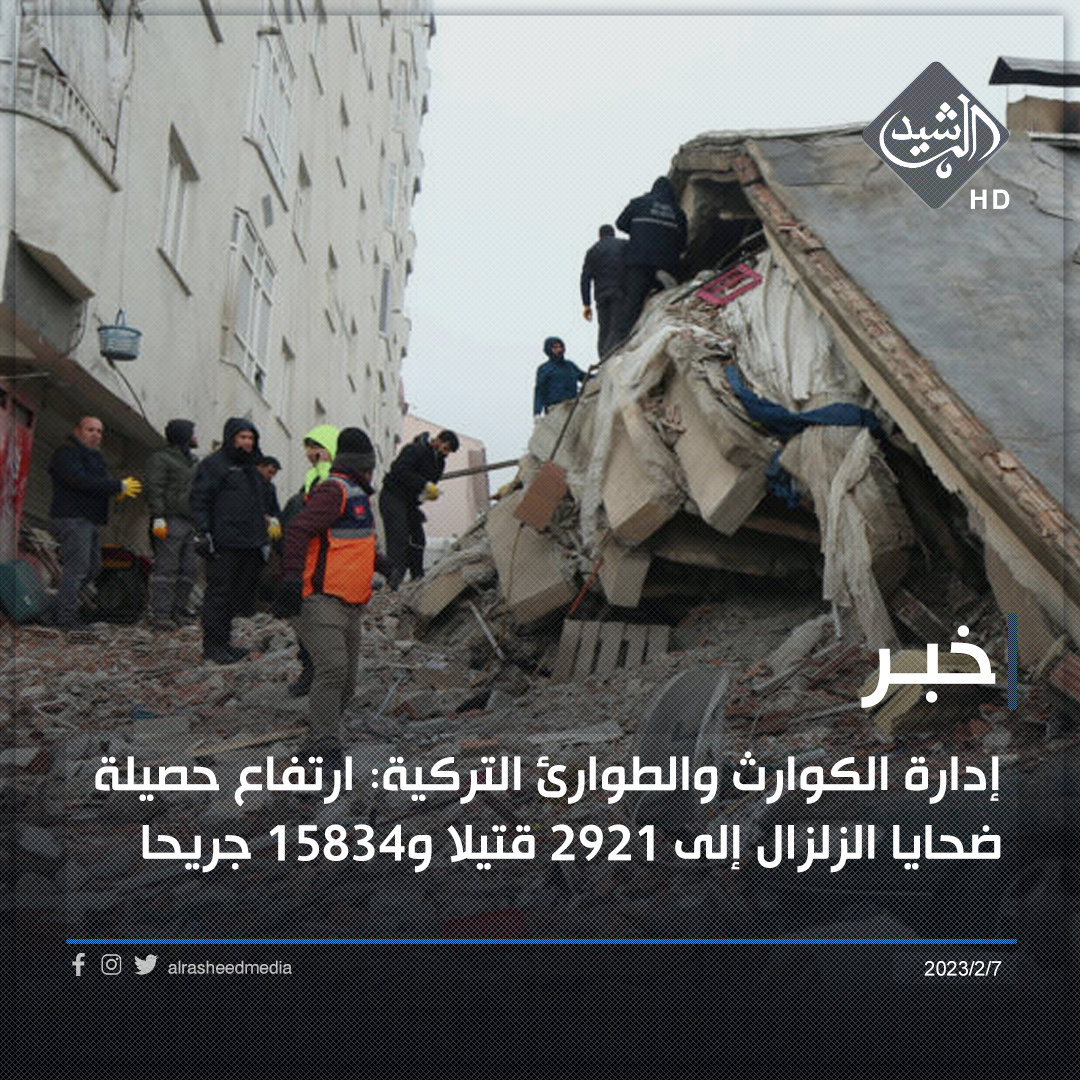 إدارة الكوارث والطوارئ التركية: ارتفاع حصيلة ضحايا الزلزال إلى 2921 قتيلا و15834 جريحا