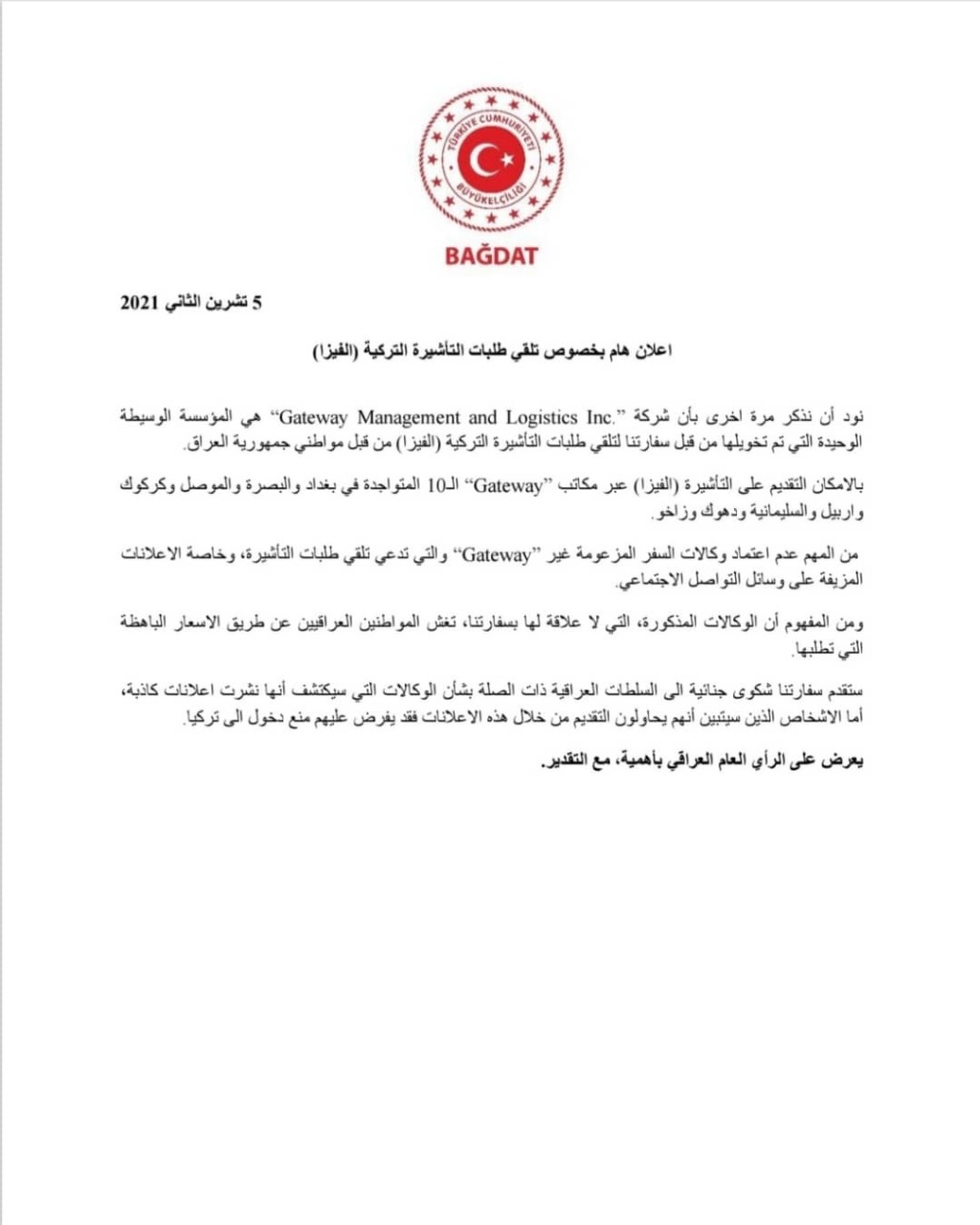 السفارة التركية تصدر توضيحا بشأن منح التأشيرة للعراقيين وتحذر من المكاتب الوهمية
