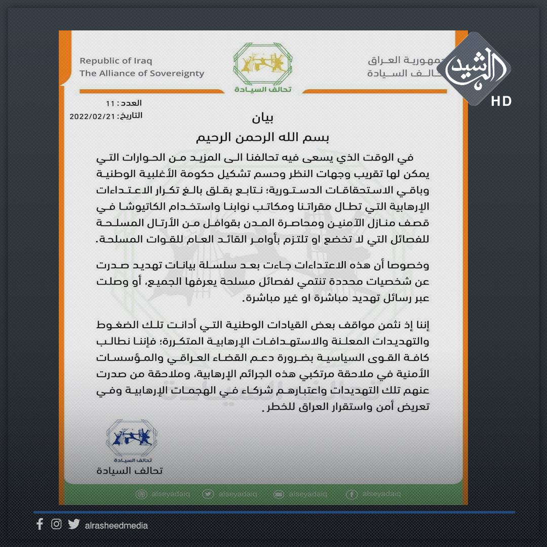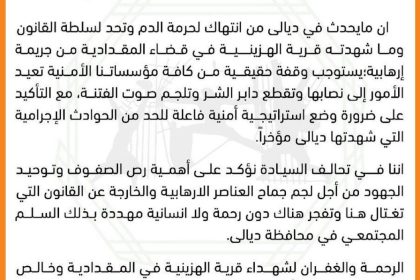 تحالف السيادة يصدر بيانًا بشأن الانتهاكات المستمرة في ديالى