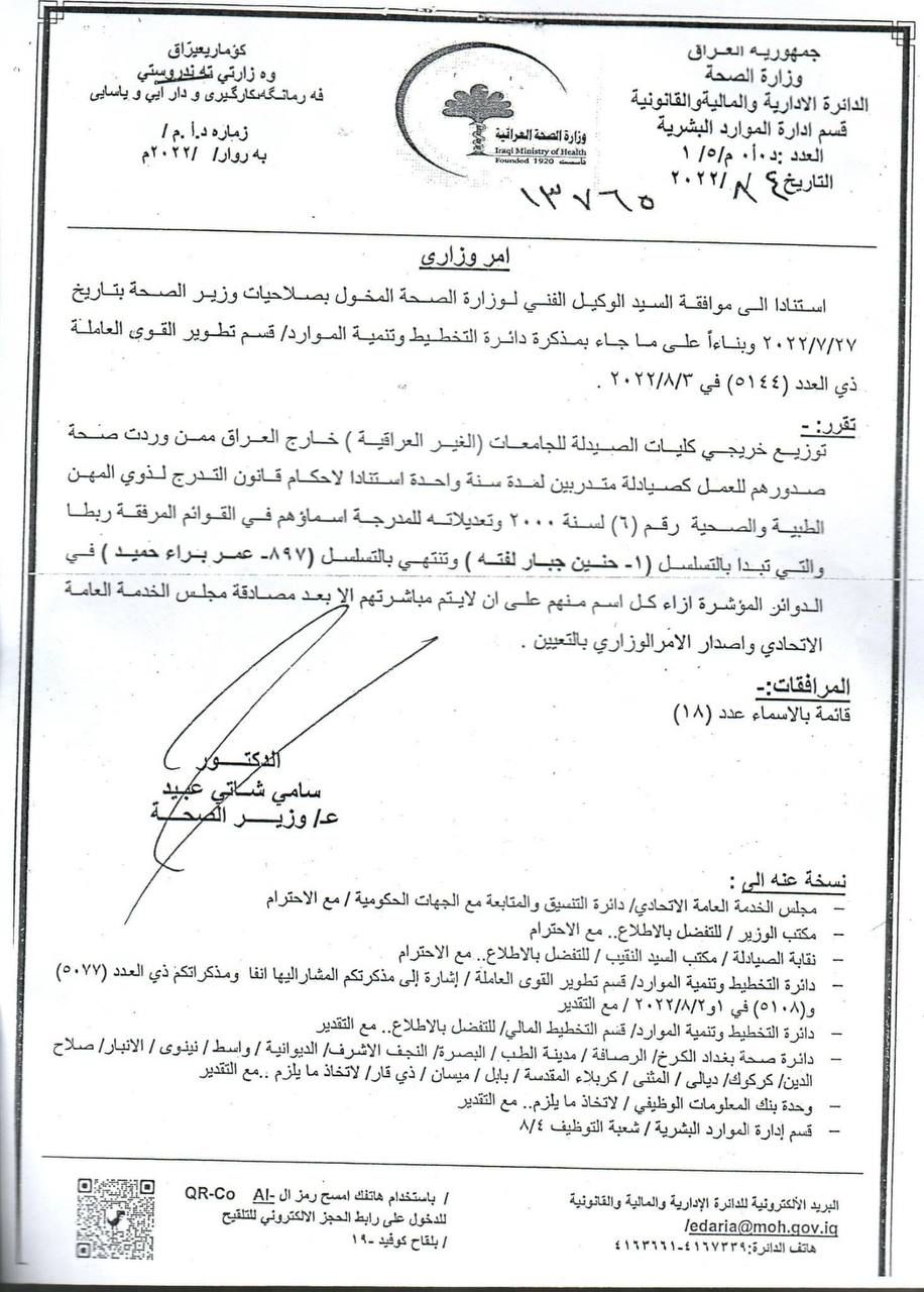 بالوثيقة.. الصحة تصدر امرا وزاريا بتوزيع خريجي كليات الصيدلة للجامعات غير العراقية
