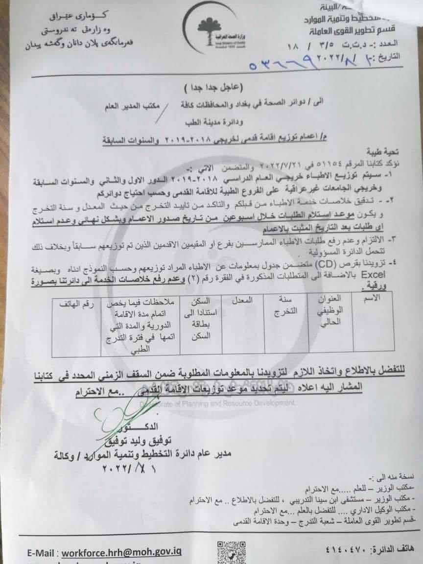 بالوثيقة.. الصحة تعلن توزيع خريجي 2018 – 2019 والسنوات السابقة