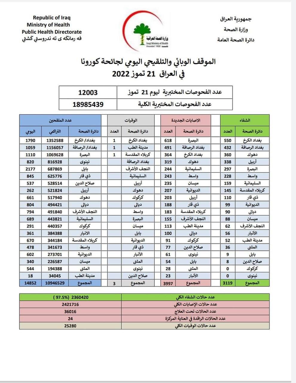 الصحة تعلن تسجيل 3997 اصابة جديدة بكورونا في عموم العراق