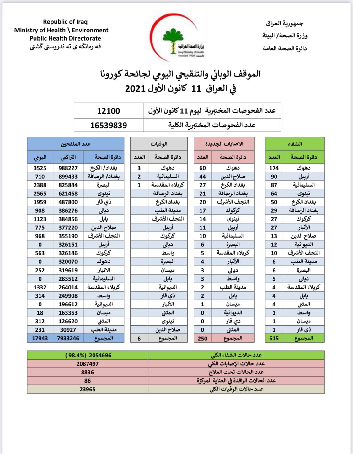 الصحة تعلن تسجيل 510 اصابة جديدة بكورونا في عموم العراق