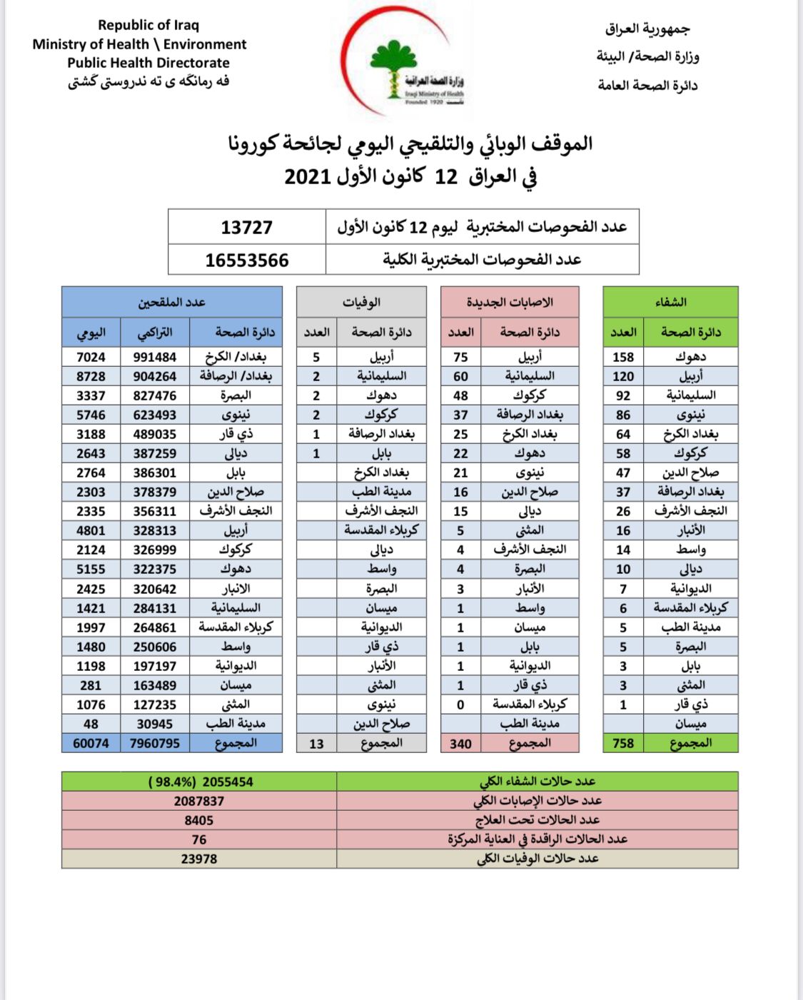 الصحة تعلن تسجيل 12 وفاة بكورونا و 762 حالة شفاء من الفيروس