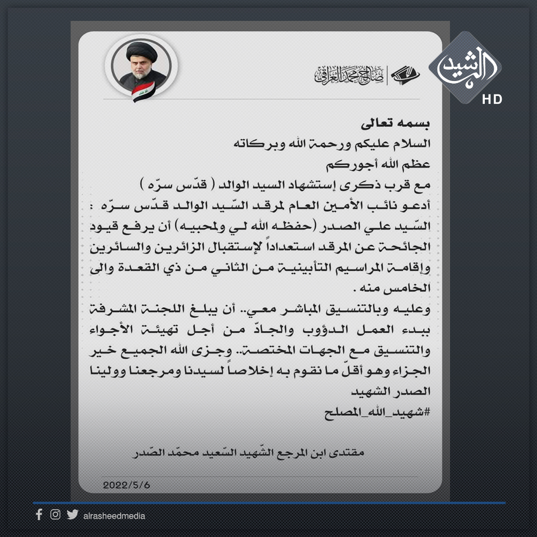 السيد الصدر يوعز برفع قيود كورونا عن مرقد والده