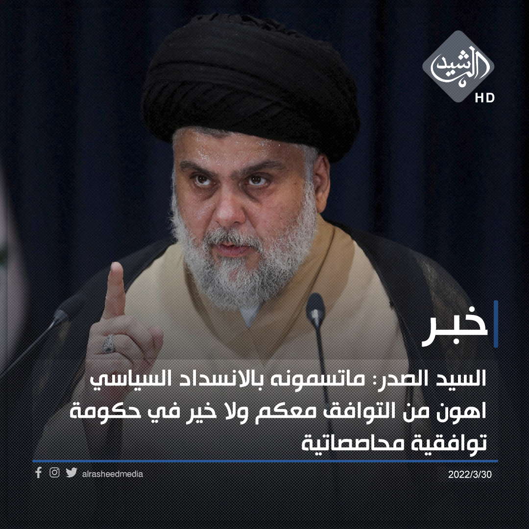 السيد الصدر: ماتسمونه بالانسداد السياسي اهون من التوافق معكم ولا خير في حكومة توافقية محاصصاتية