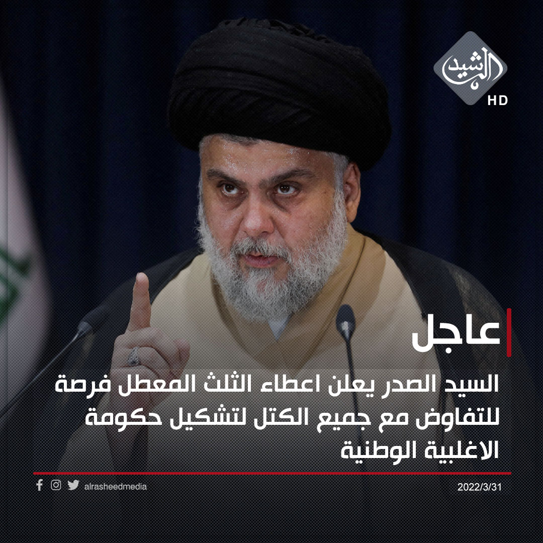 السيد الصدر يعلن اعطاء الثلث المعطل فرصة للتفاوض مع جميع الكتل لتشكيل حكومة الاغلبية الوطنية